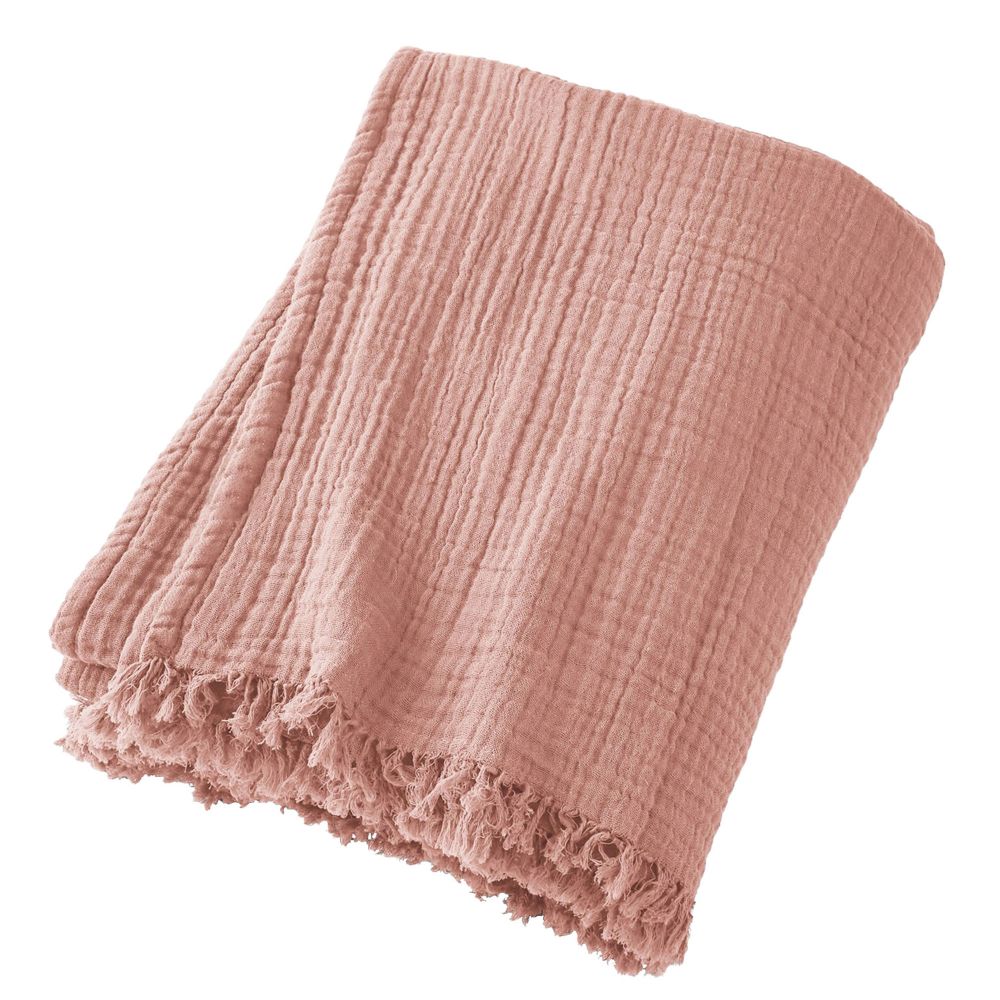 Plaid à franges 130x160 cm gaze de coton rose
